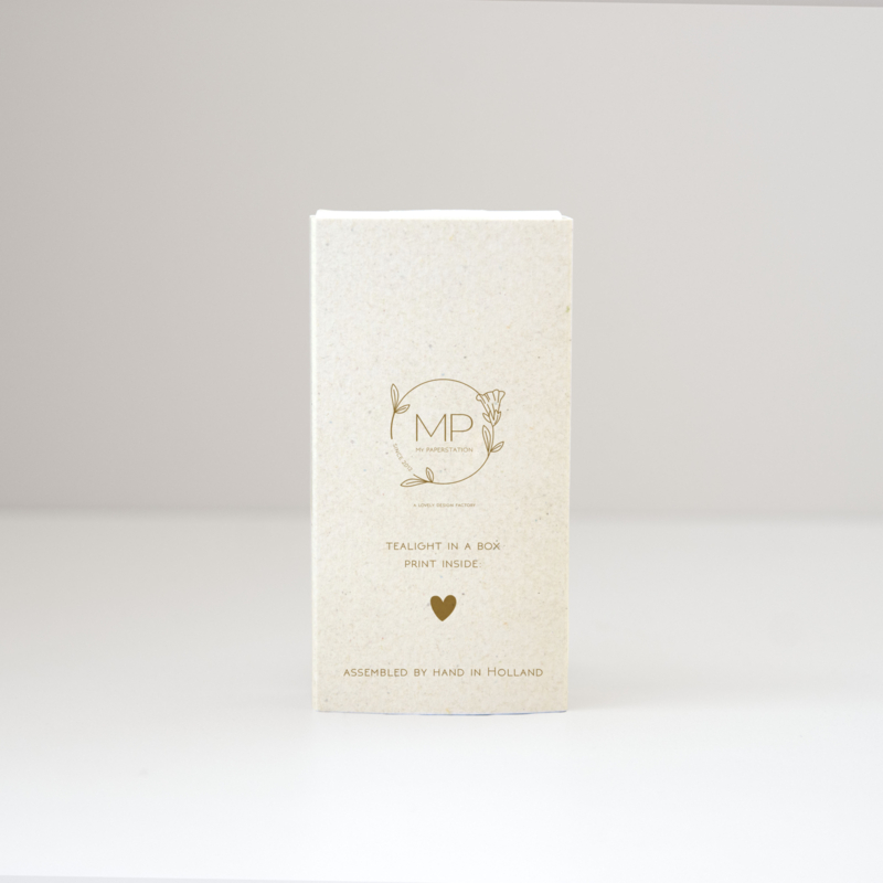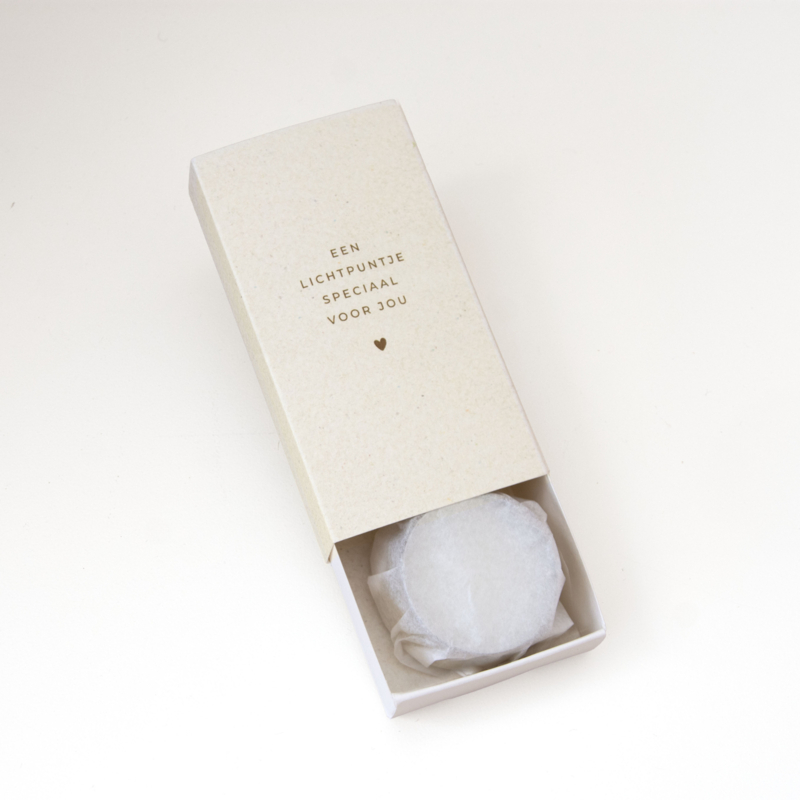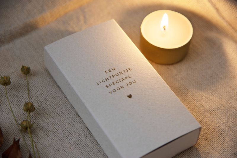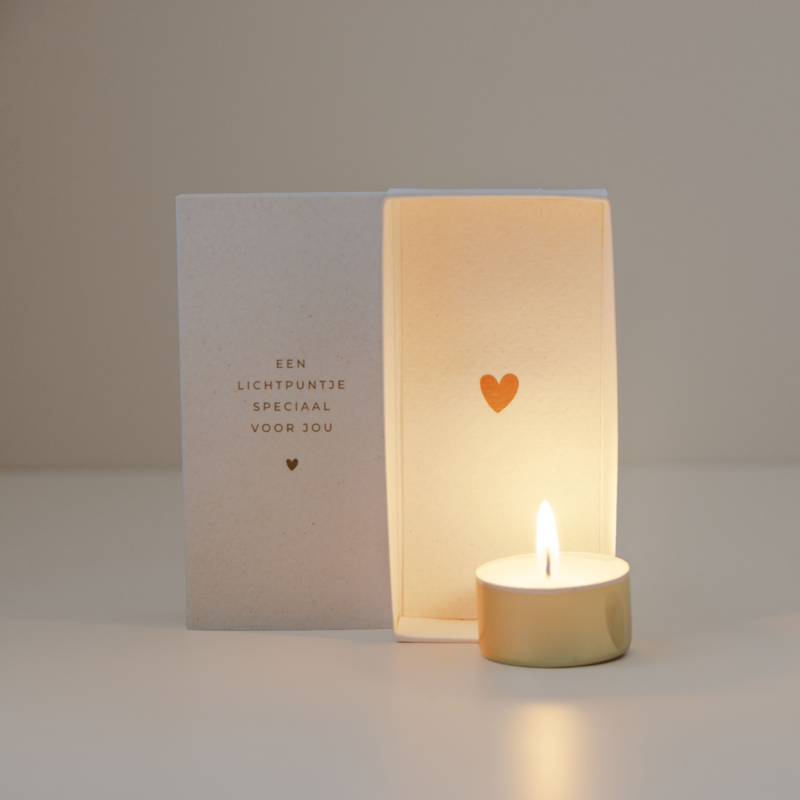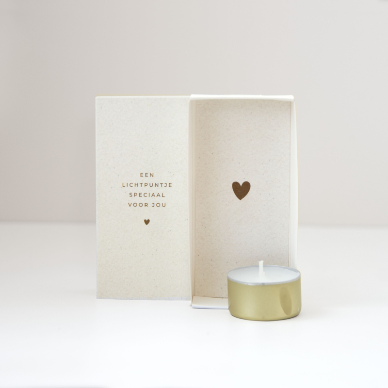 Dit doosje bevat een verpakt waxinelichtje met gouden cup en een subtiele binnenboodschap in de vorm van een hartje. Een eenvoudig, liefdevol gebaar dat altijd op het juiste moment komt.