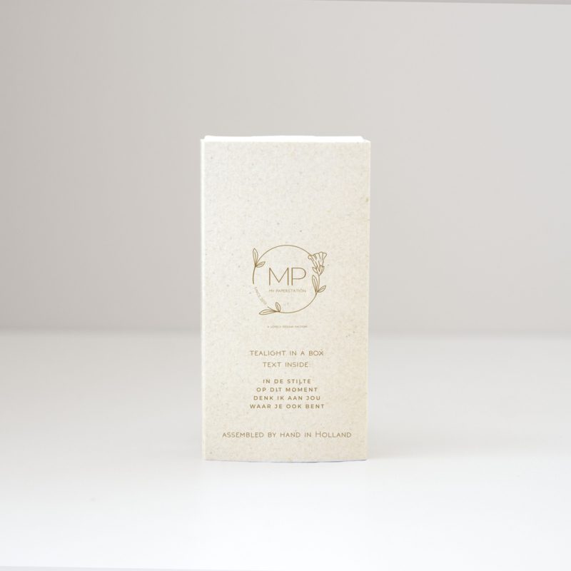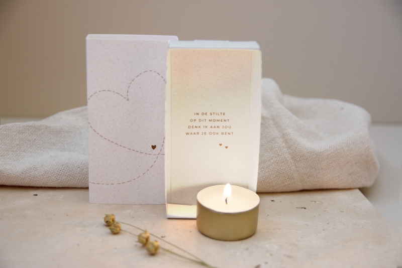 Dit doosje bevat een verpakt waxinelichtje met gouden cup en een liefdevolle boodschap, een klein lichtpuntje dat iemand door een moeilijke dag heen kan helpen.