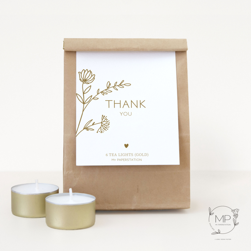 In het papieren zakje zitten 6 Bolsius® waxinelichtjes in gouden cup.
