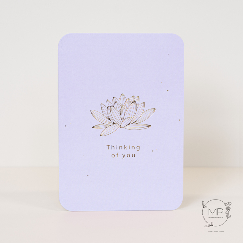Postcard ‘Thinking of you' / 5 piecesKaart met gouden opdruk en voorzien van afgeronde hoeken.