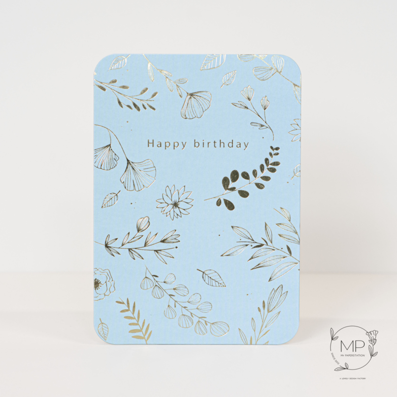 Postcard Happy birthday / 5 piecesKaart met gouden opdruk en voorzien van afgeronde hoeken.